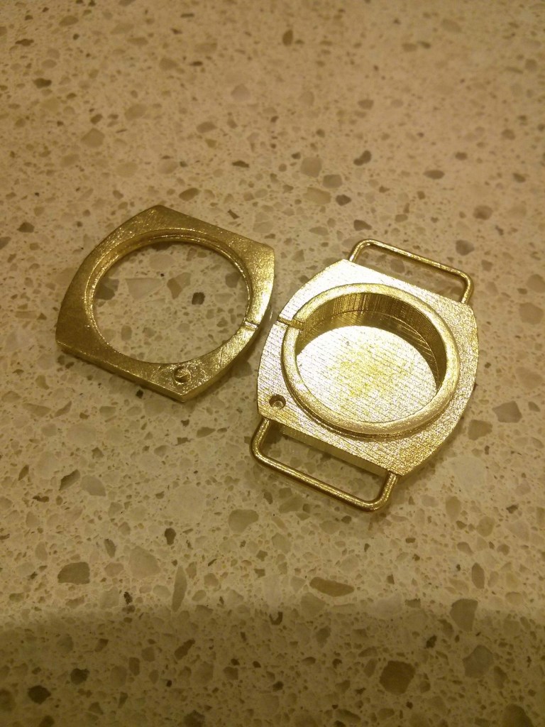 Modelled in Creo, 3D printed into brass. Polished and then electroplated. Assembled using modern quartz movement with original hands.